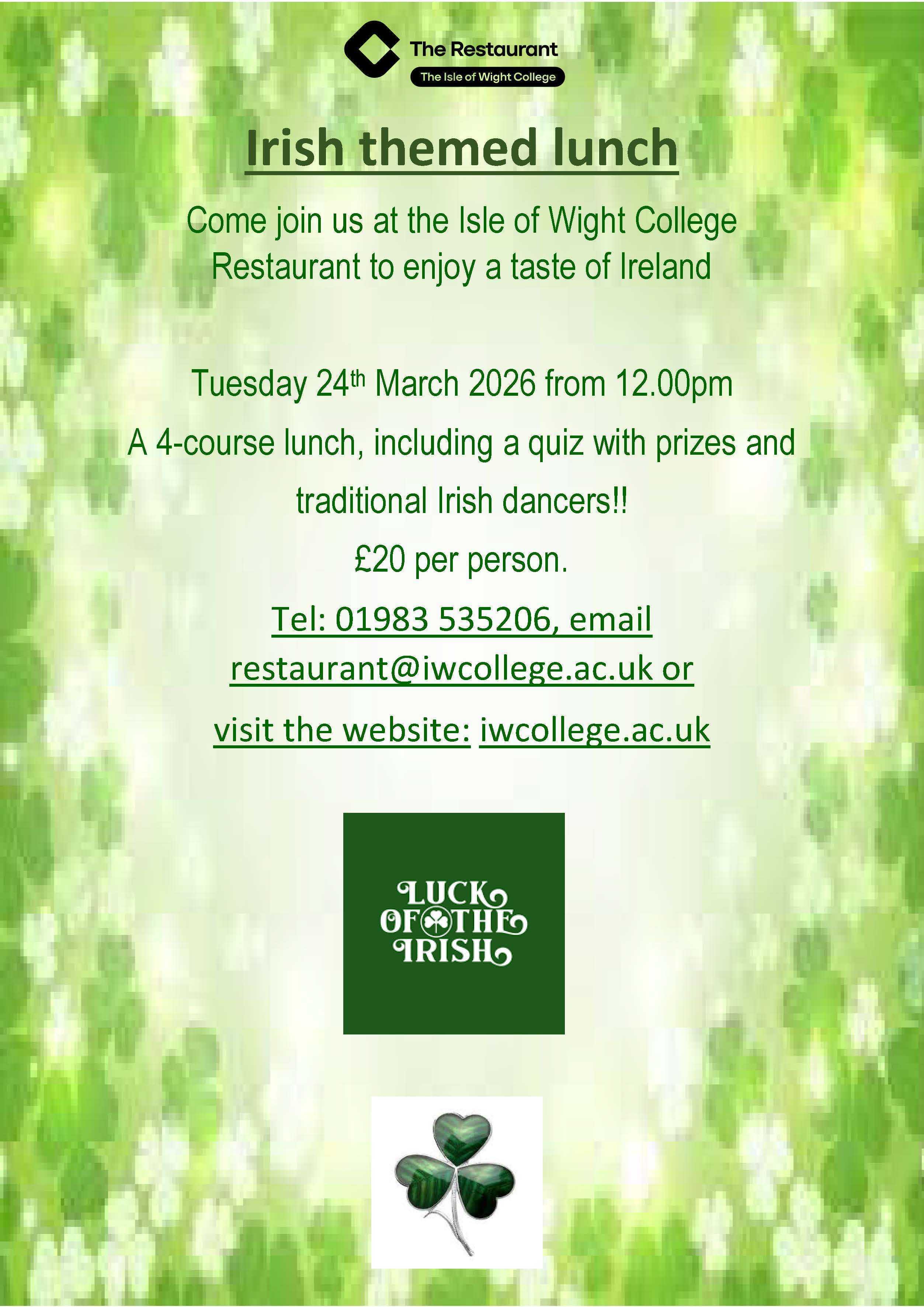 Come and join us in the Restaurant for a taste of Ireland, including a 4-course lunch, a quiz and traditional Irish dancers.